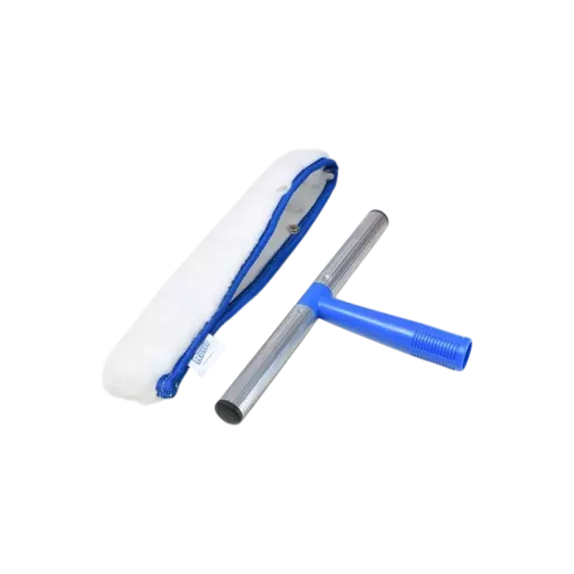 Enjabona y lava los vidrios y espejos de manera eficaz y eficiente. Soporte T de aluminio y plástico con vellón. Para usar en forma manual o anexándolo a una extensión de aluminio profesional para trabajos en altura.